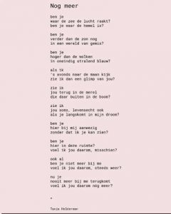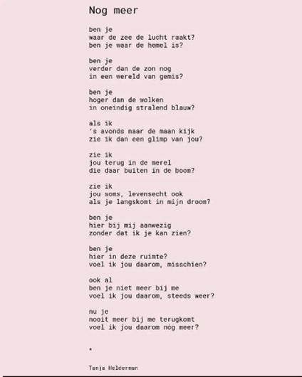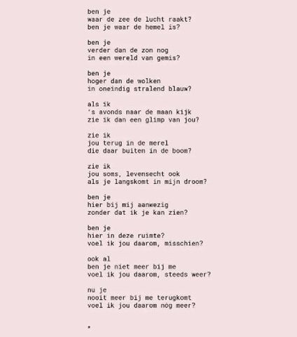 Een gedicht over liefde die niet ophoudt wanneer iemand wegvalt. Over hoe aanwezigheid soms juist sterker wordt wanneer je iemand niet meer kunt aanraken. En over hoe het gemis zich kan omvormen tot een stille, troostende vorm van nabijheid – een aanwezigheid die je niet ziet, maar wel voelt. πŸ’–