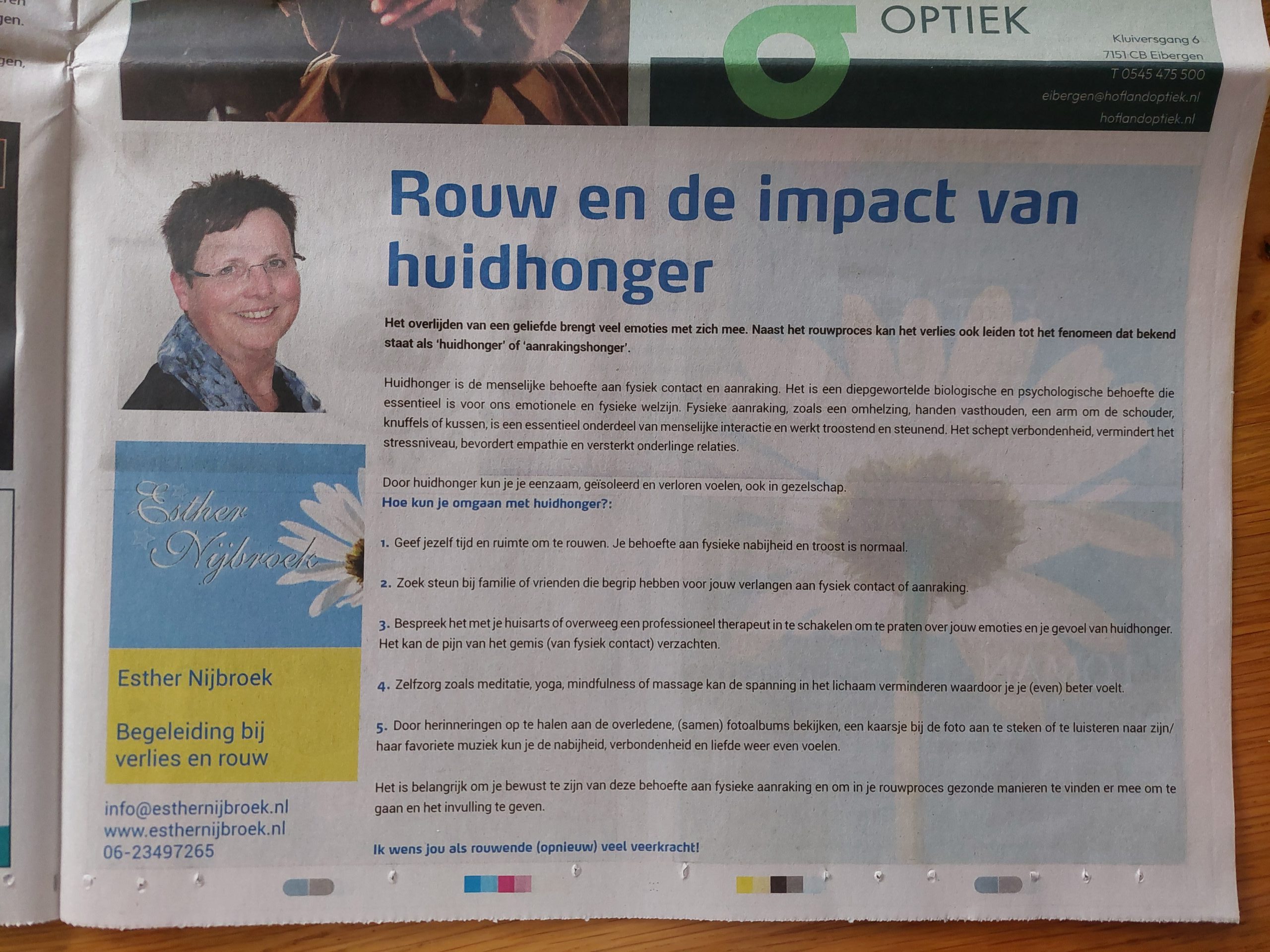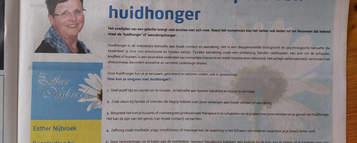 Vorige week in Nieuwsuitberkelland.nl te lezen geweest. Ik heb al veel reacties gehoord omdat het zo herkenbaar is en nauwelijks bespreekbaar. Ik was het artikel vorige week vergeten te plaatsen op mijn Facebookpagina π€ Door er nu opnieuw aandacht aan te besteden mag ik het begrip huidhonger, en de impact er van op jouw rouw, nogmaals onder de aanbracht brengen. π